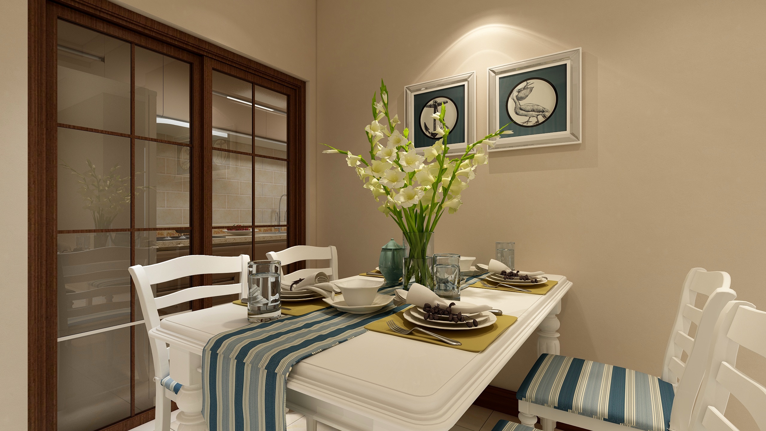 整體采用米白色的基調,搭配墨綠色顯得更加和諧。桌子上的黃色的墊子和墻壁色彩呼應。綠色清新的盆栽植物將餐廳裝點成溫馨、平和的田園風格,更能增添食欲。褐色的推拉門,在田園風格中加一點點復古,使整個布局更加時尚。