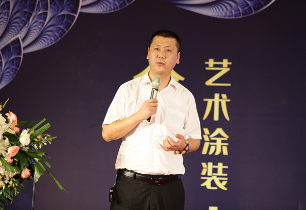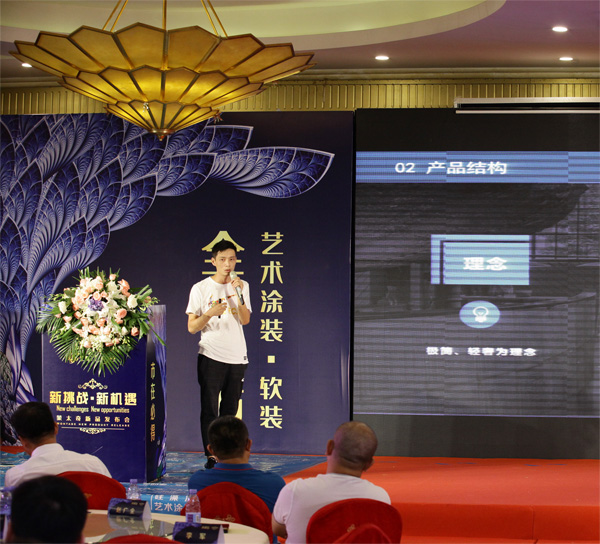 現場,蒙太奇技術總監羅總對藝術涂料,從起源到應用進行多方面分析,讓經銷商深入了解蒙太奇藝術涂料新品。